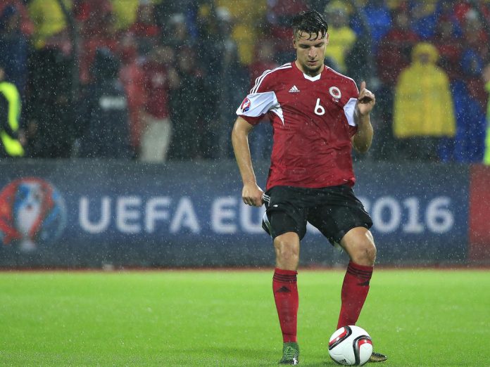 ELBASAN, ALBANIA - OCTOBER 08: Berat Xhimshiti of Albania in action during the Euro 2016 qualifying football match between Albania and Serbia at the Elbasan Arena in Elbasan on October 08, 2015. (Photo by Srdjan Stevanovic/Getty Images)