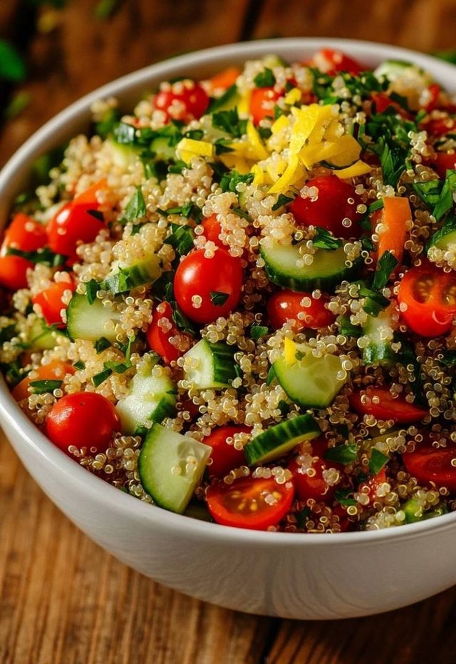 Prisni imët qepët dhe lëkurën e limonit në fije të holla. Lëngun e tij lëreni mënjanë. Prisni perimet e tjera, kaurdisini me pak vaj dhe shtojani tiganit të quinoas bashkë me borzilokun, rukolën e prerë në copa. Rregulloni shijen me kripë dhe piper. Siaps dëshirës, shtoni sasinë e lëngut të limonit. Servirien mund ta bëni sipas dëshirës, qoftë duke e hedhur në forma të vogla që përmbysen në pjatë, qoftë në formë të çrregullt.