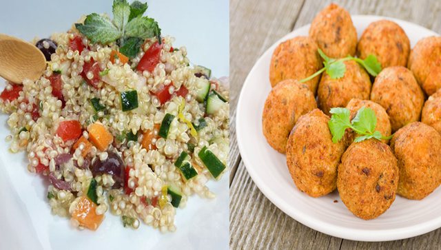 Së pari, zieni quinoan në një enë me ujë të valuar për 10 minuta. Ndërkaq, lani dhe grini në rende kungullin. Shtojeni kungullin te ena e quinoas dhe zieni për 5 minuta të tjera. Kullojini të dyja dhe lërini të ftohen. Në një enë, përzieni quinoan, kungullin, vezën, miellin dhe rregulloni shijen me kripë dhe piper. Me duar, formoni qofte të vogla sa madhësia e një topi pingpongu. Kalojini në bukën e grirë dhe hidhini të skuqen në vajin e ngrohur më parë deri sa të marrin ngjyrë të artë. Pas skuqjes, lërini në letër kuzhine të iki vaji i tepërt dhe servirini.