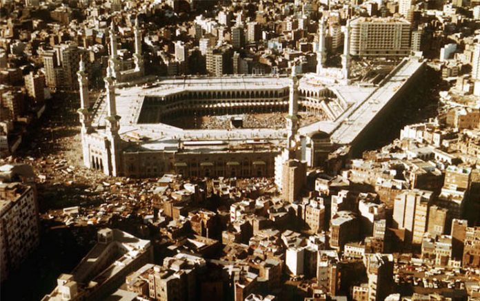 Rrugët e stërmbushura në Mekë. Mund të shihen edhe minaret e stilit osman.