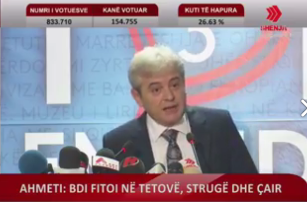Kryetari i BDI-së, Ali Ahmeti ka mbajtur konferencë për gazetarë ku a njoftuar për fitoren e partisë së tij në Tetovë, Strugë, Dibër, Saraj, Dibër, Likovë, Dollnen, Tearcë, Pllasnicë dhe Kërçovë.