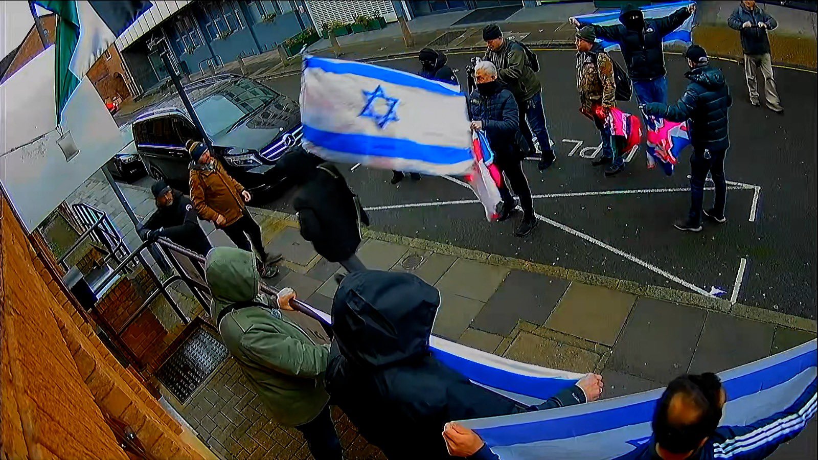 Fotot e publikuara bashkë me deklaratën tregojnë demonstrues që mbajnë flamujt e Izraelit dhe Britanisë para ndërtesës të shtunën, ndërsa disa prej tyre shihen duke u ngjitur në shkallët e ambasadës dhe duke pozuar për fotografi.