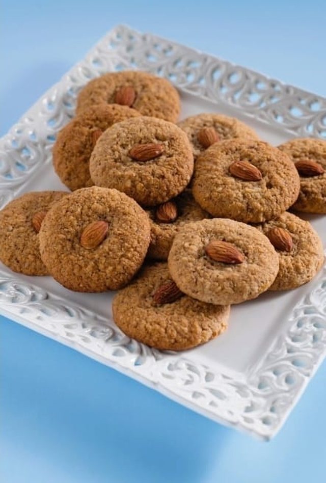 PËRGATITJA: Grijmë në mikser arrat me një lugë miell orizi, derisa të bëhen thërrime. Në një tas, përziejmë me lugë druri miellin e orizit që na ka mbetur, me miellin e misrit, sodën që e hedhim me sitë, arrat e grira, sheqerin, gjalpin, mjaltin, vezën të rrahur më parë me pirun, lëkurën e grirë të limonit dhe një majë thike kripë. I përziejmë më pas me dorë, derisa të përftojmë një brumë që nuk ngjit. E mbështjellim me plastmasë kuzhine dhe e lëmë në frigorifer për 30 minuta. Pas kësaj kohe nxjerrim brumin nga frigoriferi dhe me dorë bëjmë topa të vegjël sa një kokërr arre. I vendosim në tavë me letër furre dhe me duar të lagura i shtypim, për t’i bërë më të sheshta. Sipër u vendosim nga një bajame sipas dëshirës. I pjekim për rreth 15 minuta në furrën e ngrohur më parë në 180° C ose derisa të shohim që kanë marrë ngjyrë të artë. Kur janë të nxehta, janë shumë delikate, prandaj, kur të jenë ftohur, i heqim nga tava me ndihmën e një aksesori të sheshtë.