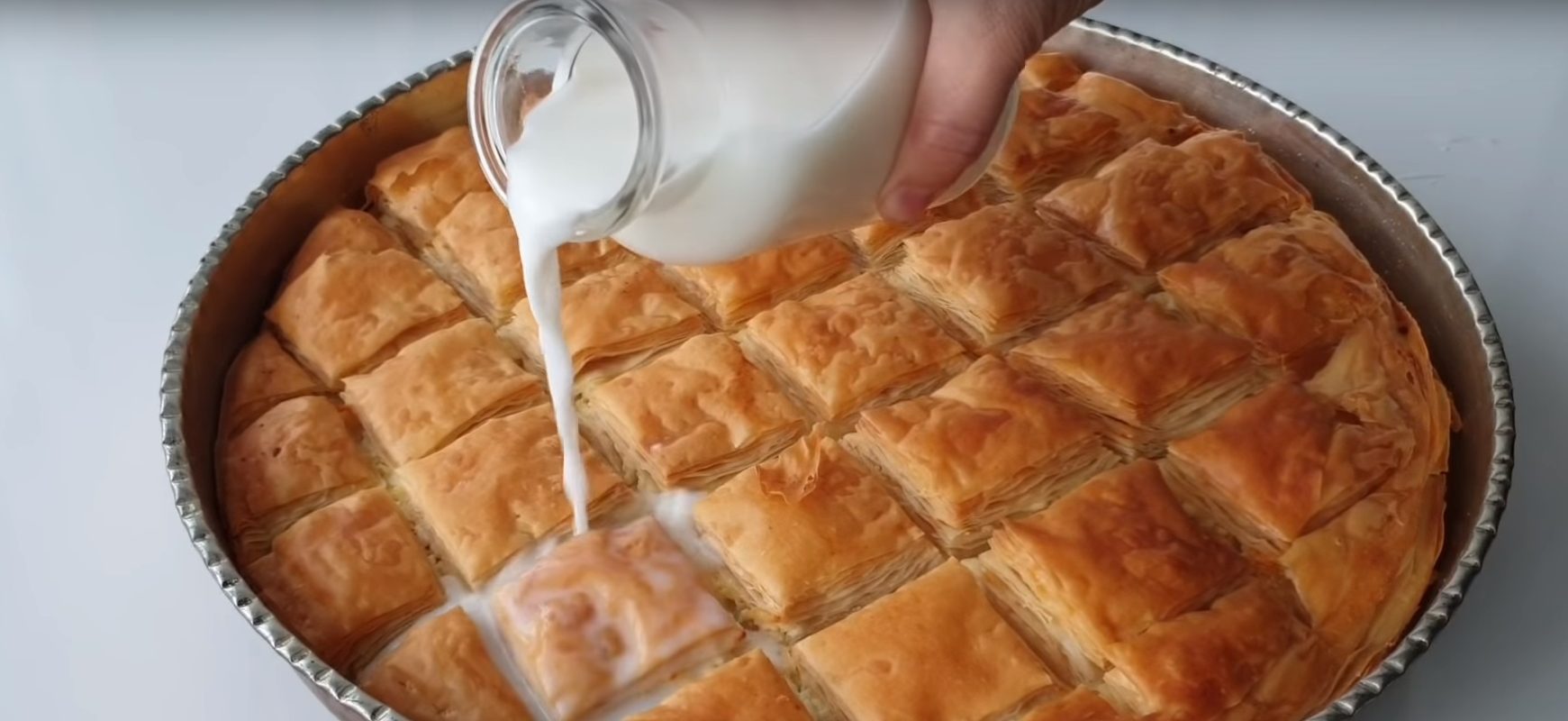 - Kur byreku të ketë marrë një ngjyrë të artë, pra pas 45-50 minutash, nxirreni nga furra dhe hidhni përzierjen me qumësht dhe ujë.