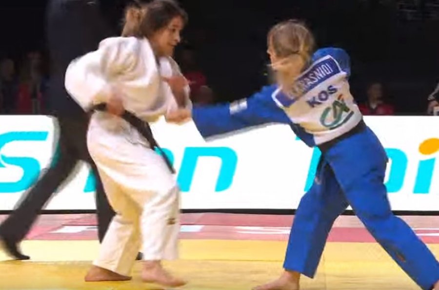 Distria është duke garuar në kategorinë deri në 52 kilogramë, kategori kjo në të cilën jemi mësuar ta shohim Majlinda Kelmendin, që po mungon në turneun e madh të Parisit.