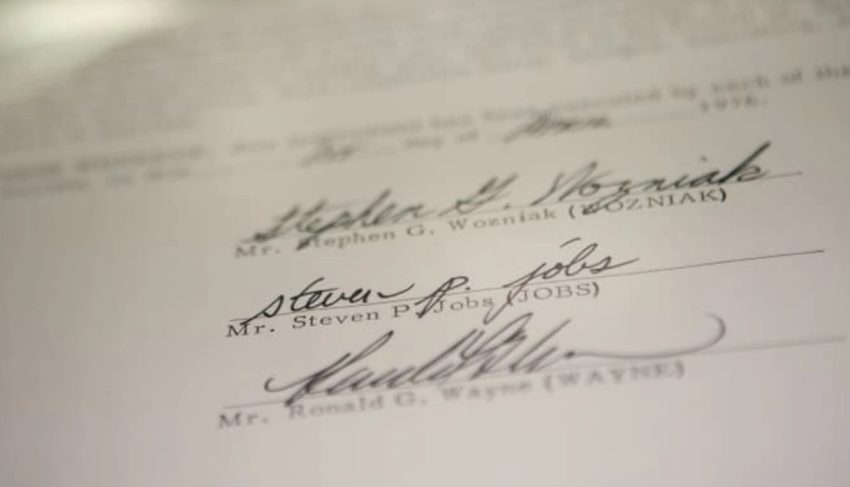 Në të janë nënshkrimet e Steve Jobs, Steve Wozniak dhe Ron Wayne, si dhe aksionet e tyre në kompaninë që më vonë do të bëhej një nga më të mëdhatë në botë.