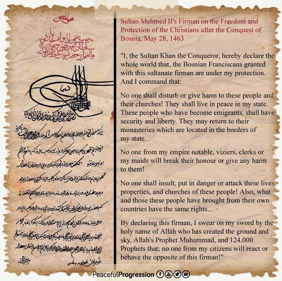 | “Nişân-ı hümâyûn oldur ki, Ben ki Sultan Mehmed Han’ım; cümle havâss u avâma ma’lûm ola ki, İş bu dârendegân-ı fermân-ı hümâyûn Bosna rahiplerine mezid-i inayetim zuhûra gelüp buyurdum ki:Mezbûrlara ve kilisalarına kimesne mâni’u müzâhim olmayub, ihtiyâtsız memleketimde duranlara ve kaçup gidenlere emn-ü amân ola ki gelüp bizim hâssa memleketimize havfsız sâkin olup kilisalarında mütemekkin olalar ve yüce hazretimden ve vezirlerimden ve re’âyalarımdan ve memleketim halkından kimesne, mezbûrlara dahl-ü ta’arruz etmeyüp incitmeyeler. Kendülerine ve cânlarına ve mâllarına ve kilisalarına ve dâhi yabandan hâssa memleketimize âdem getürirler ise yemîn-i mugallaza iderim ki, yeri göğü yaradan Perverdigâr Allah’ın hakkı içün ve ulu Peygamberimiz Muhammed Mustafa sallallâhu te’âla aleyhi ve sel-lem hak-kı içün ve yedi Mus-haf hakkı içün ve yüzyirmidört bin peygamberler hakkı içün ve kuşandığım kılıç içün bu yazılanlara bir ferd muhâlefet eylemeye, mâdâm ki benim hidmetime ve emrime mutî’ olalar”. | Ky është nishani perandorak (fermani), Unë jam Sulltan Mehmet Khan; le të dihet nga të gjithë njerëzit e zakonshëm dhe të shquar, se unë i kam dhënë një përkujdes të madh klerit boshnjak [Françeskan] që mbajnë në dorë fermanin e tim sulltanor dhe kam thënë:Askush nuk do t’i pengojë apo shqetësojë të lartpërmendurit dhe kishën e tyre dhe ata do të jetojnë në vendin tim pa hezitim. Edhe ata që ikin do të jenë të sigurt. Edhe ata që do të vijnë, do të vendosen pa frikë në vendin tonë dhe do të vendosen në kishat e tyre. As unë, as vezirët e mi, as nënshtetasit e mi, as ndonjë nga të gjithë njerëzit e vendit tim nuk do t’i prekim, sulmojmë ose lëndojmë të lartpërmendurit.Ata, jetën e tyre, pasurinë e tyre, kishat e tyre dhe ata që vijnë në vendin tonë nga jashtë. Betohem në emrin e Furnizuesit që krijoi qiejt dhe tokën, në emrin e Kur’anit dhe të Pejgamberit tonë madhështor, në emrin e njëqind e njëzet e katër mijë profetëve dhe në shpatën që kam në dorë, se përderisa këta njerëz i binden urdhrit tim dhe asaj që është shkruar, askush nuk do t’i shqetësojë. |
