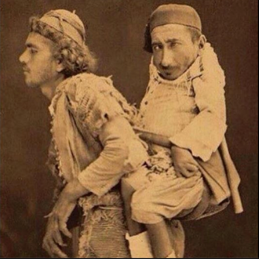 Në foto shihet një shkurtabiq i krishterë me emrin Sameer. Ai nuk mund të ecte, prandaj e mbante në shpinë një mysliman i verbër, i quajtur Mohammed.