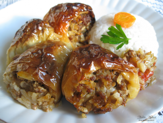 Die Paprika mit der gekochten Masse von Gemüse, Reis und Fleisch füllen, in einer Backform geben. Den Rest der übriggebliebenen Masse einfach in die Backform geben, damit die Löcher zwischen den Paprika gefüllt sind. Die Backform in den Offen stellen und bei 250 Grade für 15 Minuten backen.