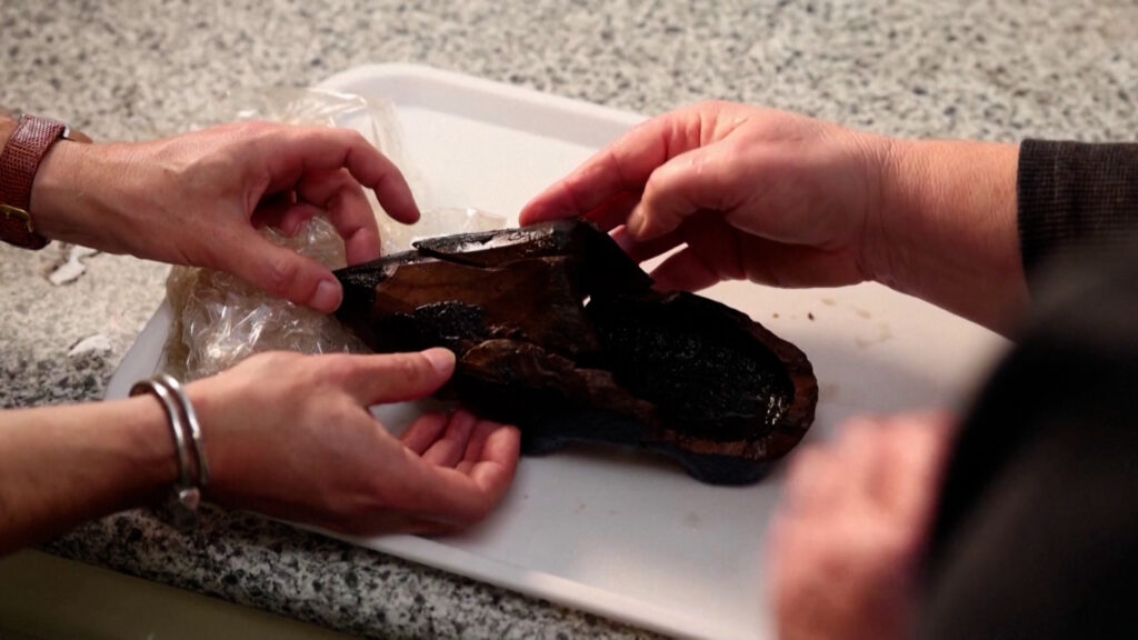 Silke Lange, arkeolog: U gjet në një gropë uji në një mjedis urban. Pra, kjo është shumë e veçantë sepse këpucët prej druri fermerët i përdornin gjatë punës së tyre, por në fakt kjo u gjet në një kontekst urban në qytetin e Alkmaar. Pra, kjo është shumë e bukur dhe është e ruajtur mjaft mirë.