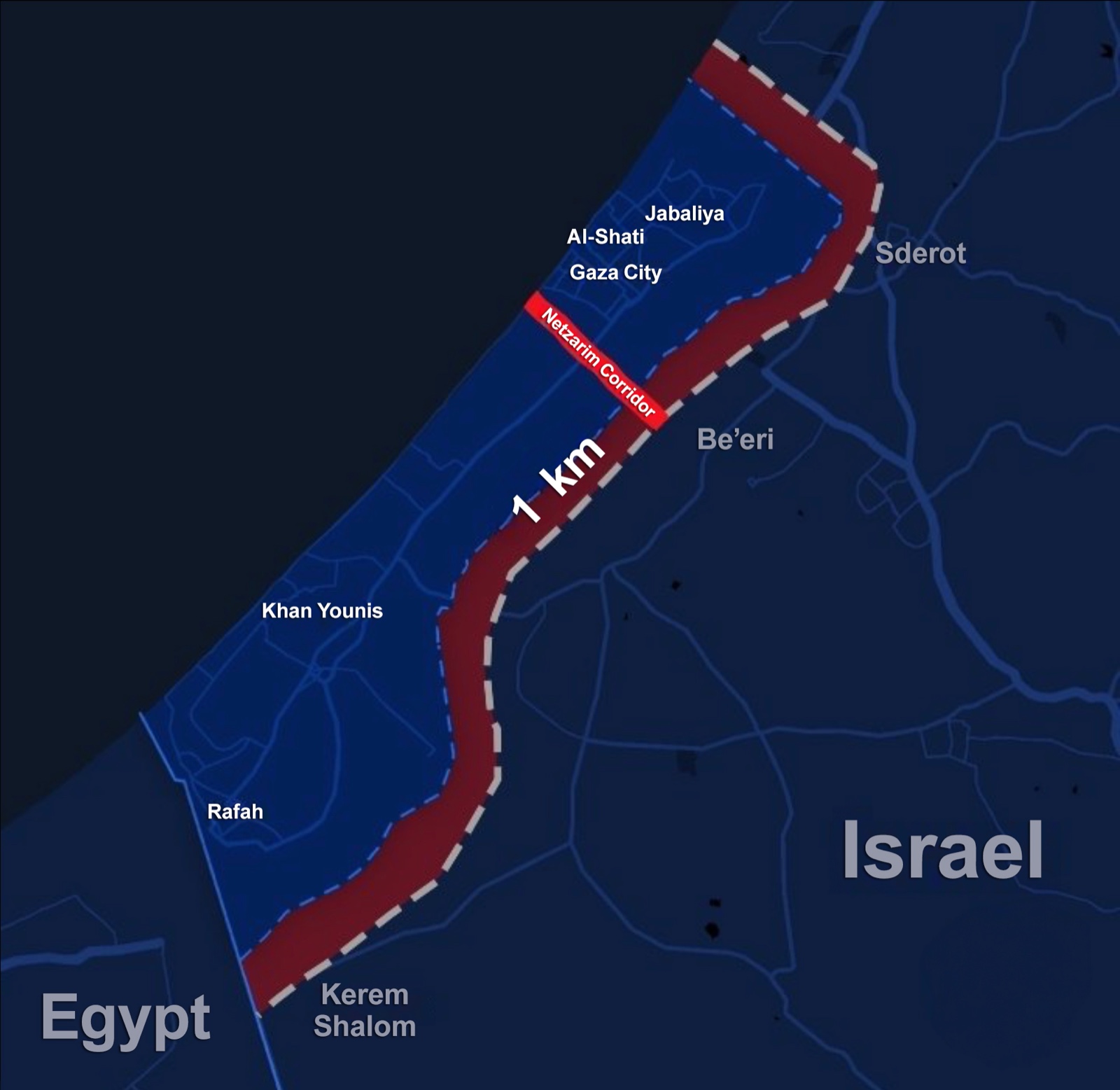 Përveç kësaj, ushtria izraelite ka marrë nën kontroll edhe një pjesë të rëndësishme të territorit të njohur si Korridori Netzarim, i cili e ndan Gazën veriore, përfshirë qytetin e Gazës, nga pjesa tjetër e territorit bregdetar me mbi 2 milionë banorë.