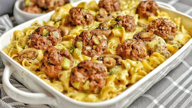 Pasi të jenë pjekur lërini mënjanë, ndërkohë përgatisni jufkat dhe salcën me qumësht. Në një tigan të madh shkrini gjalpin në zjarr mesatar. Shtoni miellin dhe hudhrën e grirë dhe kaurdisini për 1-2 minuta. Shtoni lëngun e mishit të pulës, salcën e kosit dhe qumështin në tigan dhe përzjejeni derisa salca të trashet. Nëse dëshironi mund t’i shtoni edhe djathë të bardhë për një shije më të mirë. Sapo të fillojë të mpikset uleni flakën e zjarrit dhe lëreni të ziejë edhe për 2 minuta të tjera. Ndërkohë keni vënë në zjarr një tenxhere me ujë për jufkat. Kur uji të valojë, hidhni brenda jufkat dhe lërini sa të zbuten, por jo plotësisht. Kullojini dhe hidhini në një tave të lyer mirë me vaj ulliri. Mbulojini me salcën që përgatitët dhe në fund vendosni edhe qoftet. Futini në furrë për 10-15 minuta ose derisa jufkat të kenë thithur lëngun e salcës dhe tava ka marrë një ngjyrë të artë. Lëreni të ftohen pak, dhe shërbejini të ngrohta duke i shoqëruar me sallata të freskëta. Ju bëftë mirë!