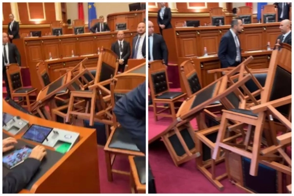 Nga pamjet e publikuara në rrjete sociale nga ish-kryeministri Sali Berisha, shihet se ligjvënësit demokratë kanë përmbysur karriget përpara foltores së Kuvendit.