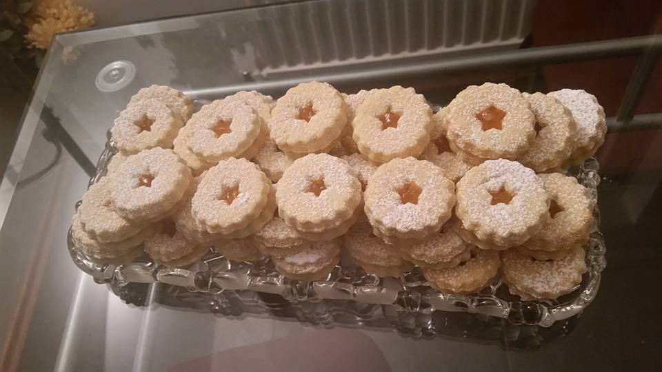 Pastaj behen hollen ne forme te rrubullaket dhe bashkohen ne mes vete ne mes mundemi ti vendosim mermollad.Format mundemi ti bejm sipas deshires .. Dekorohen me Sheqer Pluhur.