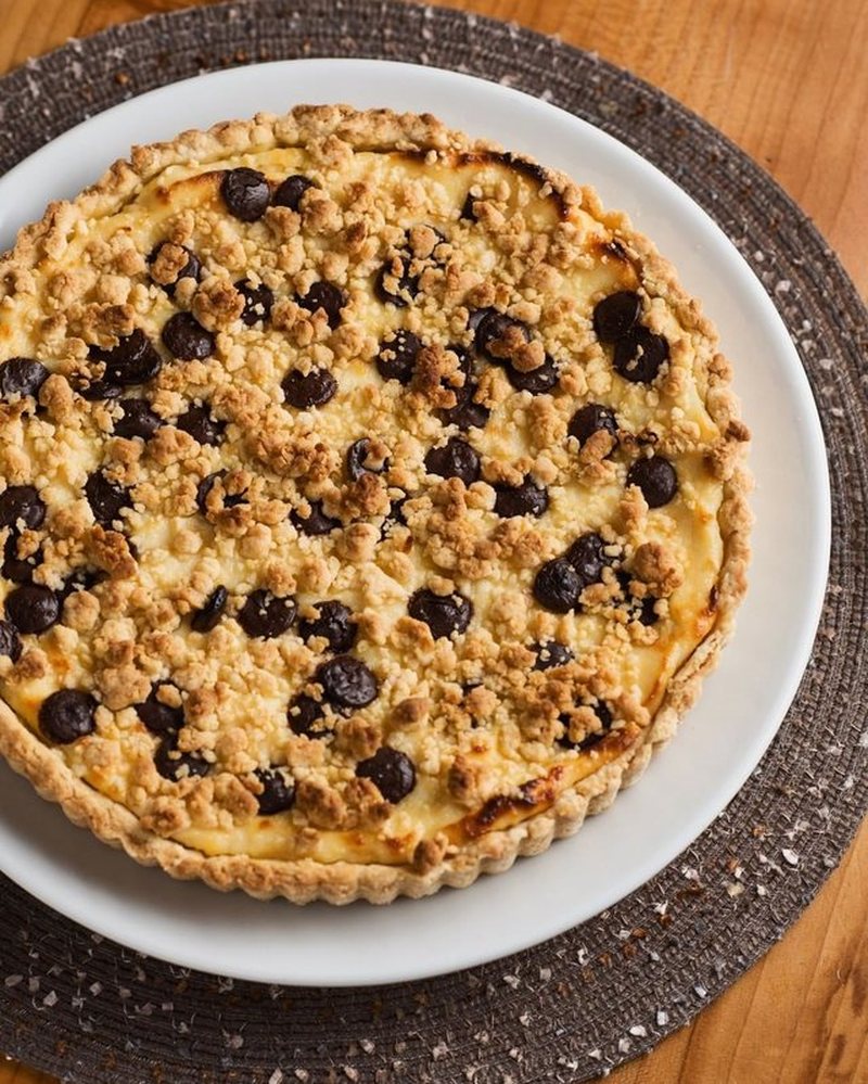PËRGATITJA E BRUMIT: Në një tepsi hedhim miellin, bëjmë një gropë në mes dhe hedhim gjalpin. E punojmë me majat e gishtave, derisa të përftojmë thërrime. Shtojmë vezët, lëkurën e limonit, sodën me sitë, sheqerin dhe një majë thike kripë. E punojmë brumin me dorë shumë pak, e mbështjellim me plastmasë kuzhine dhe e lëmë në frigorifer për 1 orë. Në një tas hedhim ricotta-n( kullojmë lëngun që ka në kuti), vezën, sheqerin dhe lëkurën e portokallit. I përziejmë me pirun, derisa të përftojmë një masë kremoze. Pas një ore, ndezim furrën në temperaturën 170°C. Hapim brumin (2/3 e sasisë së tij) me petës, veshim tavën të lyer më parë me gjalpë e pak miell. Shpërndajmë kremin me ricotta-n dhe çokollatën e thërrmuar. Me brumin që na ka mbetur bëjmë rripa, i vendosim sipër dhe e pjekim për rreth 1 orë. E konsumojmë vetëm pasi të jetë ftohur plotësisht.