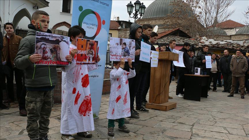 Në organizim të Lidhjes së Nxënësve Shqiptarë të Maqedonisë, me sloganin “Aleppo – Turpi i njerëzimit” qindra qytetarë u tubuan para xhamisë “Murat Pasha” në Çarshinë e Vjetër të Shkupit, për t’u solidarizuar me gjendjen e mjerueshme të popullin sirian në qytetin e Halepit, raporton Anadolu Agency (AA).
