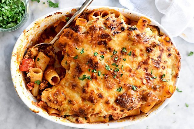 Sapo kjo e fundit të avullojë, shtoni salcën e domateve pak kripë dhe uleni zjarrin në minimum. Salcën e përgatitur lëreni të gatuhet edhe për 10 – 15 minuta të tjera e më pas lëreni të ftohet në temperaturë ambienti. Ndërkohë vini të ziejnë makaronat në ujë më kripë si zakonisht derisa të jenë “al dente”, pra jo shumë të ziera. Kullojini dhe hidhini në një enë të thellë, po aty shtoni dhe salcën që përgatitët në tigan e më pas përzieni mirë të gjithë përbërësit. Po aty shtoni edhe beshamelën të cilën mund ta merrni të gatshme në dyqan ose të mësoni si përgatitët duke pare receten ne faqen tone . Tek ena shtoni edhe djathin e bardhë të thërrmuar dhe vazhdoni me përzierjen me kujdes derisa e gjithë ena me makaronat dhe salcën të ketë një pamjë uniforme. Zgjidhni një tavë pjekje prej qelqi dhe shtroni aty makaronat duke i përhapur me lugë nëpër të gjithë sipërfaqen e saj. Spërkasni sipër me djathë kaçavall të grirë dhe futeni të piqet në furrë të ngrohtë në temperaturën 180 gradë për 20 minuta. Në 5 minutat e fundit mund ta ngrini pak temperaturën në mënyrë që të përfitoni një shije më krokante