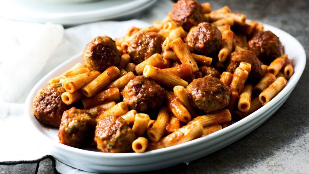 Me baze salcë domatesh dhe qofte të bëra në shtëpi.