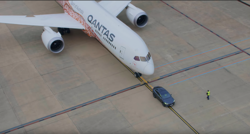 Makina në fjalë ka qënë TeslaModel X P100D, që shfaqet duke tërhequr një avion për 300 metra.