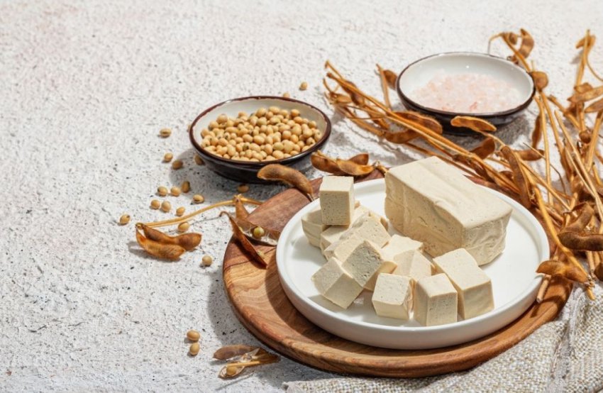Tofu është një burim i shkëlqyer proteinash me bazë bimore, me pak yndyrë të ngopur dhe pa kolesterol. Rekomandohet skuqja e tij me shafran të Indisë (për ngjyrë), hudhër, qepë dhe perime. Për shije djathi, shtoni maja ushqyese dhe vitaminë B12.