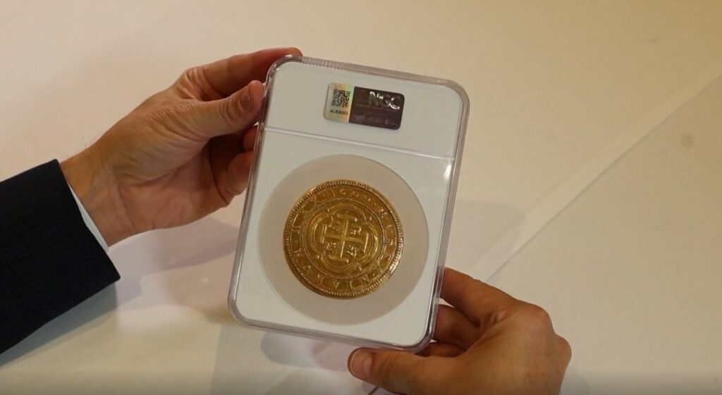 U shit të hënën në një ankand në Gjenevë për 3.4 milionë dollarë. Monedha ka një peshë prej 339 gramësh dhe është emetuar në Spanjë në kohën e mbretit Filip i Tretë.