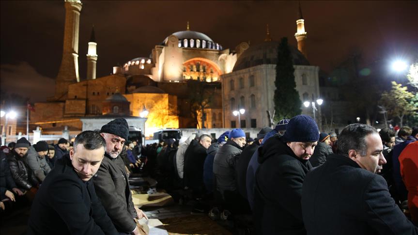 Anëtarët e Shoqatës Rinia e Anadollit (AGD) në sheshin Ajasofja në Stamboll kanë falur namazin e natës për të shtypurit në Arakan, Halep dhe Gaza, raporton Anadolu Agency (AA).