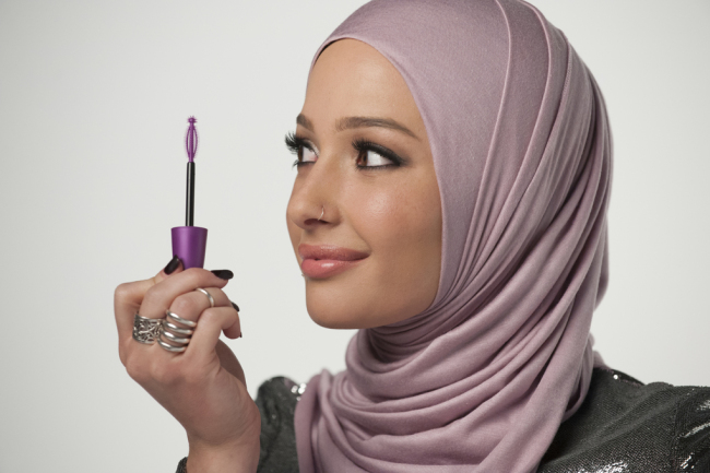 Modelja e CoverGirl Nura Afia është e veshur me shaminë tradicionale myslimane, dhe reklamon një ngjyrë për vetulla.