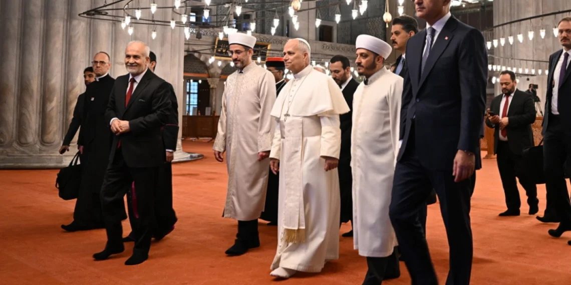 Papa Leo vizitoi Xhaminë e famshme Blu të Stambollit, duke hequr këpucët në shenjë respekti, por pa u dukur se po lutej gjatë vizitës së tij të parë si udhëheqës i Kishës Katolike Romake në një vend adhurimi mysliman gjatë qëndrimit të tij katër-ditor në Turqi.