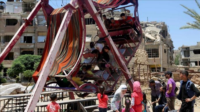 DUMA/ANKARA – Fëmijët në rajonin Duma të Damaskut i cili është nën rrethimin e regjimit sirian përpiqen që gëzimin e Bajramit ta përjetojnë në Luna parkun e ngritur në mesin e ndërtesave të shkatërruara, raporton Anadolu Agency (AA).