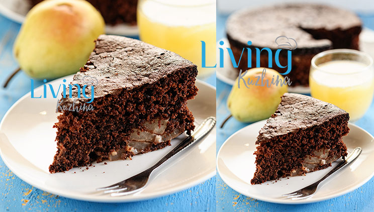 150g miell misri i bluar imët ● 100g niseshte ● 80g kakao e hidhur ● 260g sheqer ● 50g mjaltë ● 5vezë ● 70g gjalpë i tretur (i ftohur) ● 1 bustinë sodë për ëmbëlsira (16g) ● 4 dardha ● 1 majë thike kripë