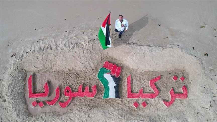 Piktura tregon emrat e Türkiye dhe Sirisë të shkruar në rërë, me një grusht të mbështjellë me flamurin e Palestinës në mes.