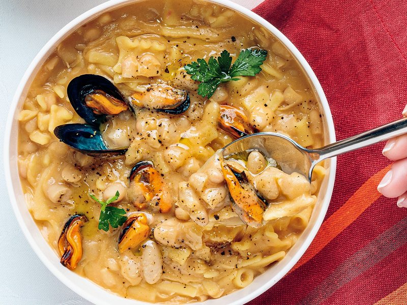 Në një tenxhere shtojmë vaj ulliri, selinonë, hudhër, domate dhe pak borzilok. I skuqim pak minuta dhe shtojmë fasulet. Bashkojmë me to lëngun e midhjeve, makaronat dhe shtojmë pak ujë që nevojitet për përfundimin e zierjes. Në fund hedhim midhjet e pastruara dhe rregullojmë shijen me kripë dhe piper.