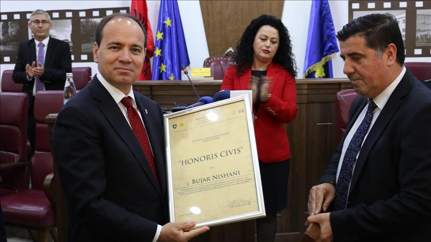 Presidenti i Republikës së Shqipërisë, Bujar Nishani me iniciativën e Kryetarit të Komunës së Gjilanit Lutfi Haziri u shpall “Qytetar Nderi” nga Kuvendi Komunal i Gjilanit, raporton Anadolu Agency (AA).