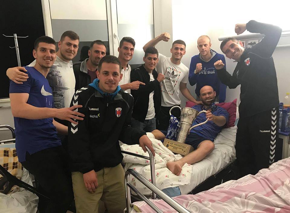 Ishte aksidentuar me veturë pas ndeshjes së javës së shkuar ndaj Dritës dhe për më tepër nuk e kishte parë skuadrën e tij të zemrës me trofe në duar.Por, një të tillë e ka shijuar të dielën mbrëma, teksa disa nga lojtarët e FC Prishtinës i kanë ofruar atij trofeun e Kupës së Kosovës, shkruan Gazetasheshi.com.