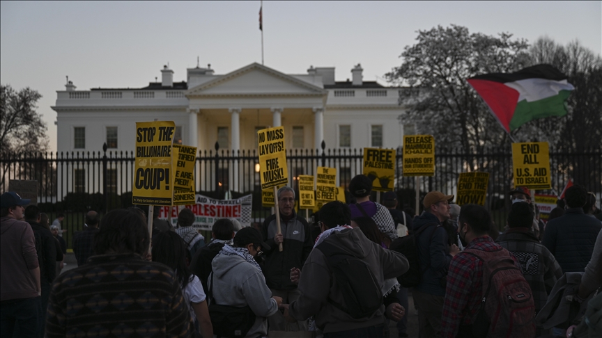 Disa protestues pro-palestinezë mbajtën pankarta me mbishkrimet “Jepini fund të gjithë ndihmës së SHBA-së për Izraelin”, “Palestina e Lirë”, “Lironi (aktivistin palestinez) Mahmoud Khalil” dhe “Bombat amerikane shkaktojnë që mjekët në Gaza të kryejnë amputime pa anestezi”.