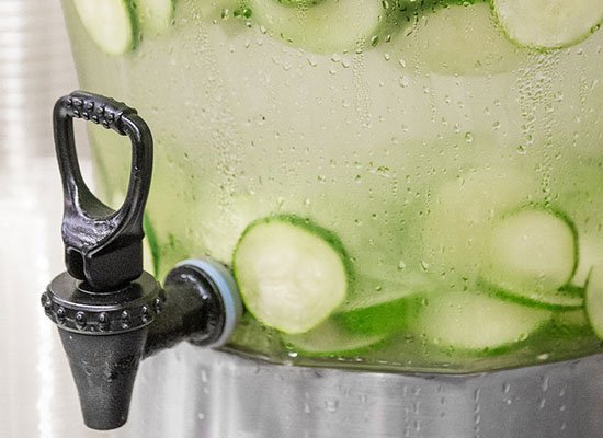 -Përmirëson shëndetin e lëkurës: Lëkura është organi më i madh në trupin e njeriut. Kontakti i drejtpërdrejtë me rrezet e diellit dhe djersitja bëjnë që lëkura të humbasë lëngje dhe të jetë më e thatë. Uji me kastravec ka në përmbajtjen e tij shumë silic, i cili eleminon toksinat nga lëkura duke e bërë të duket më e freskët dhe e re.