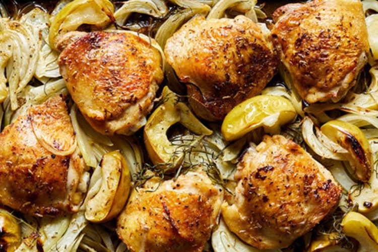 Në një enë vendosni kofshët e pulës bashkë me fetat e finokut.