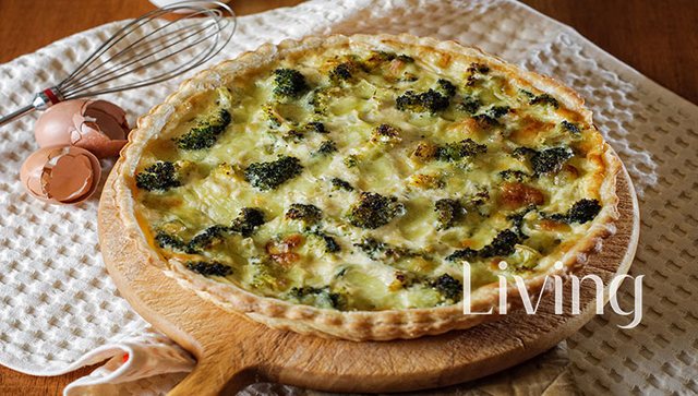 2 lugë gjelle gjalpë, 1 qepë e grirë imët, 1 thelb hudhër, 300g brokoli të pastruar, 1 petë sfoliatë, 200g mocarela, 4 vezë, 300ml qumësht, 1 lugë çaji kripë, ½ lugë çaji piper i zi.