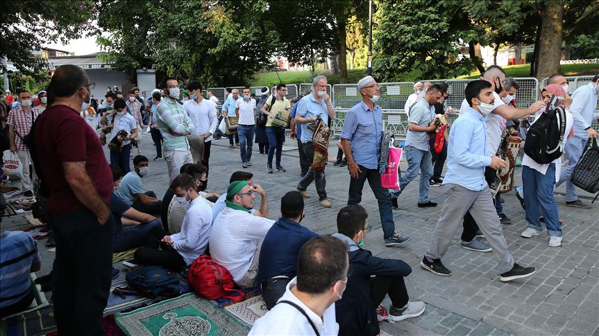 Qytetarët të cilët vërshuan në Xhaminë e Madhe të Ajasofjes për të falur namazin e sabahut, pasi nuk u lejuan në zonë e falën namazin në pikat e sigurisë, raporton Anadolu Agency (AA).