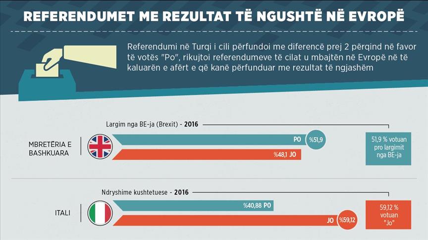 Referendumi për ndryshime kushtetuese në Turqi i cili përfundoi me 51.41 të votave “Po” në favor të ndryshimeve, rikujtoi rezultatet e ngjashme të referendumeve të cilat u mbajtën në Evropë në të kaluarën e afërt, shkruan Anadolu Agency (AA).