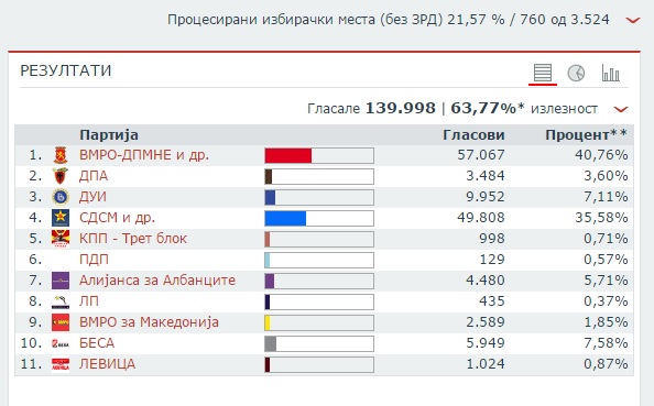 Nga numërimet e para që janë publikuar në ueb-faqen zyrtare të KSHZ, vërehet një rezultat i ngushtë mes LSDM dhe VMRO tek partitë maqedonase.