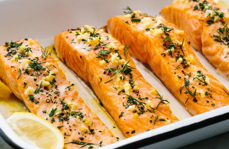 PËRBËRËSIT: 1 fileto e madhe salmoni, kripë, piper i zi, 2 limonë në feta, 6 lugë çaji gjalpë i shkrirë, 2 lugë çaji mjaltë, hudher e grirë, 1 lugë çaji gjethe trumze, 1 lugë çaji rigon, majdanoz i freskët për garniturë.