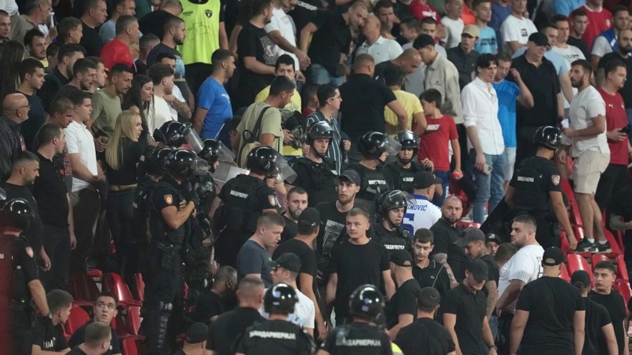 Përpara dhe gjatë ndeshjes, tifozët serbë mund të dëgjoheshin duke brohoritur “Kosova është Serbi”, teksa u panë gjithashtu duke valëvitur një banderolë provokuese që tregonte hartën e Kosovës të mbuluar me ngjyrat e flamurit serb.