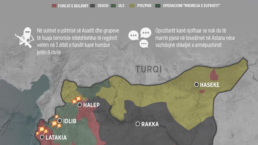 Shkeljet intensive të armëpushimit nga forcat e regjimit ku Turqia dhe Rusia janë vendet garantuese, vështirësojnë fillimin e negociatave politike në kryeqytetin Astana të Kazakistanit.