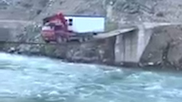 Pamjet dramatike tregojnë lëvizjen e guximshme të kamionit nëpër urën e pasigurt, ndërsa nën të është një lumë që rrjedh shpejt.