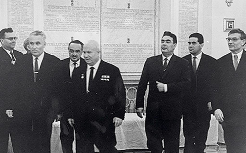 Njerëzit e rinj e epokës së viteve ’60. Kyrychenko, Brezhnev, Pidhornyi, Malynovskyi, Shelest, Shcherbytskyi dhe Kosygin në një paradë apo festival