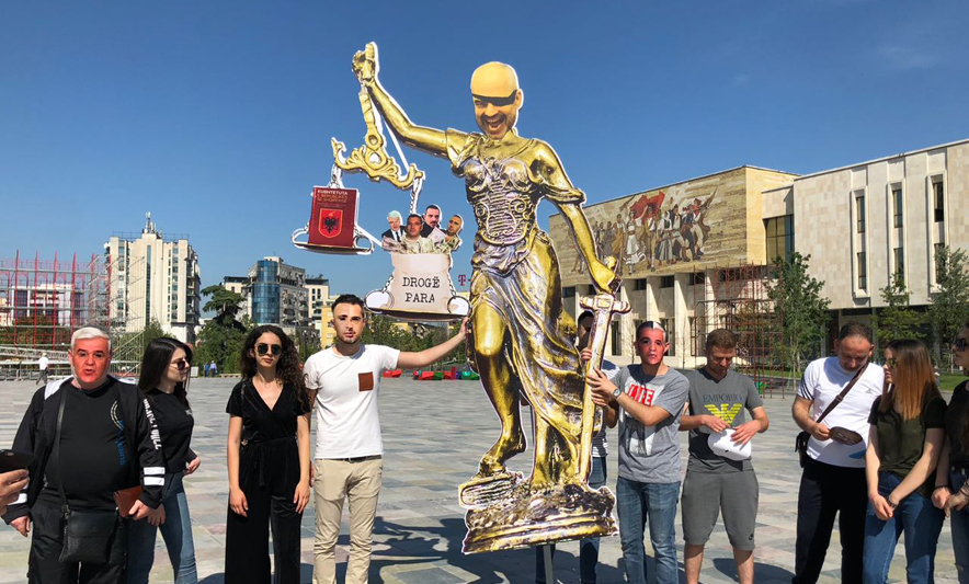Në Sheshin Skënderbej shfaqet statuja e Drejtësisë me portretin e Edi Ramës, që simbolizon kapjen politike të drejtësisë për t’i shërbyer krimit dhe korrupsionit.