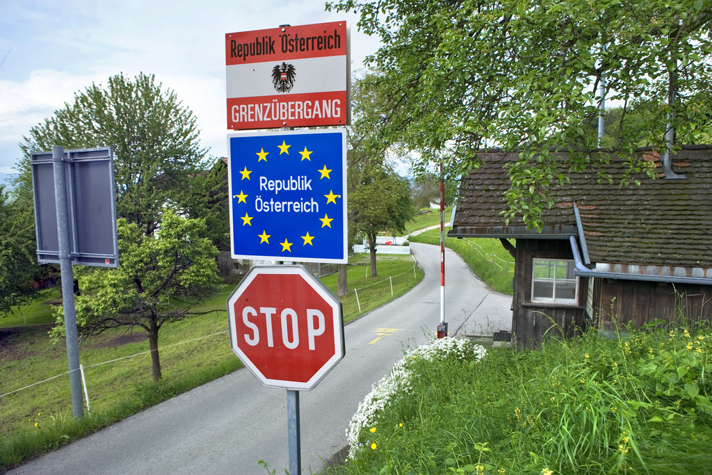 SCHENGEN, GRENZE, SCHWEIZ, LIECHTENSTEIN, OESTERREICH, GRENZUEBERGANG, ZOLL, GRUENE, GRENZE, BARRIERE, STRASSENSCHILDER, SCHENGEN, ABKOMMEN, GRENZOEFFNUNG