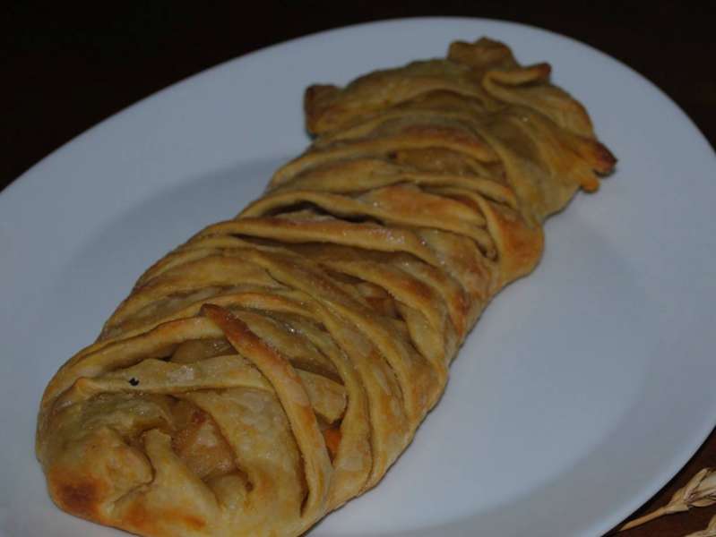 Iperziejme bashke te gjithe keta perberes. Pasi hapim peten e sfoliatit ne tavoline hedhim perzierjen mbi pete ne pjesen e mesit te saj dhe anet e saj i presim ne forme rripash qe te bejme gershetin e deshiruar