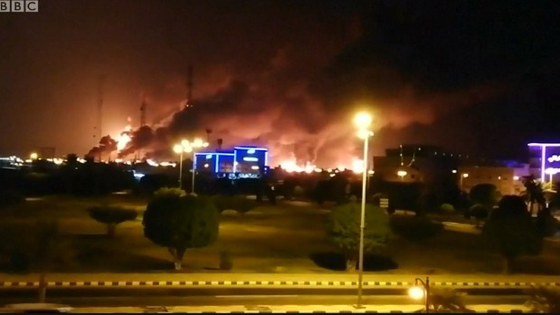 Pamjet treguan flakë dhe tym mbi Abqaiq, i cili ka fabrikën më të madhe në botë për përpunimin e naftës.